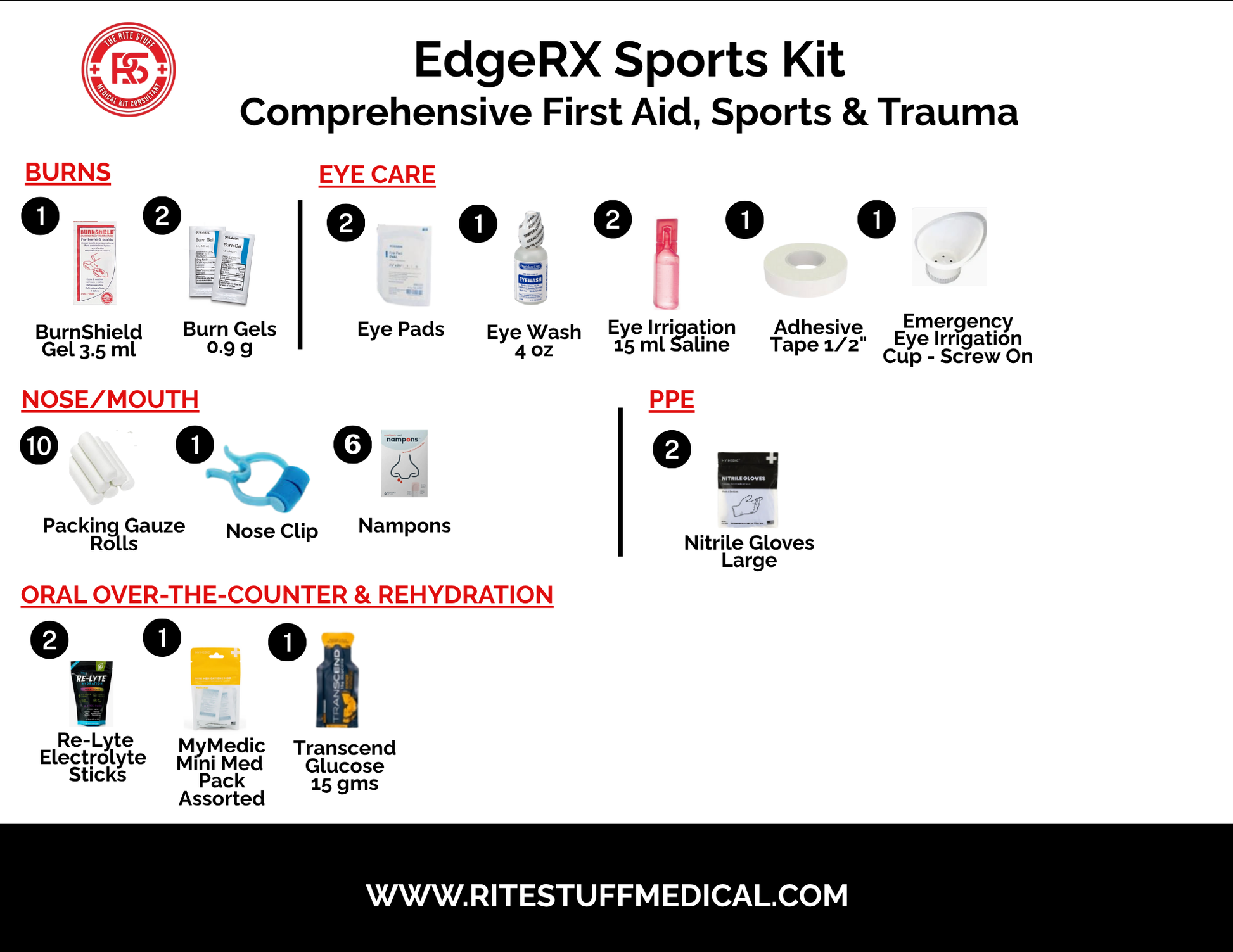 The EdgeRx Sports Kit by The Rite Stuff is your ultimate all-in-one solution for managing sports injuries, athletic emergencies, and trauma care—whether you're on the sidelines, the field, or the trail. Designed by medical professionals and athletes, this premium kit is packed with over 80 expertly chosen items to treat cuts, sprains, burns, blisters, dehydration, and more.