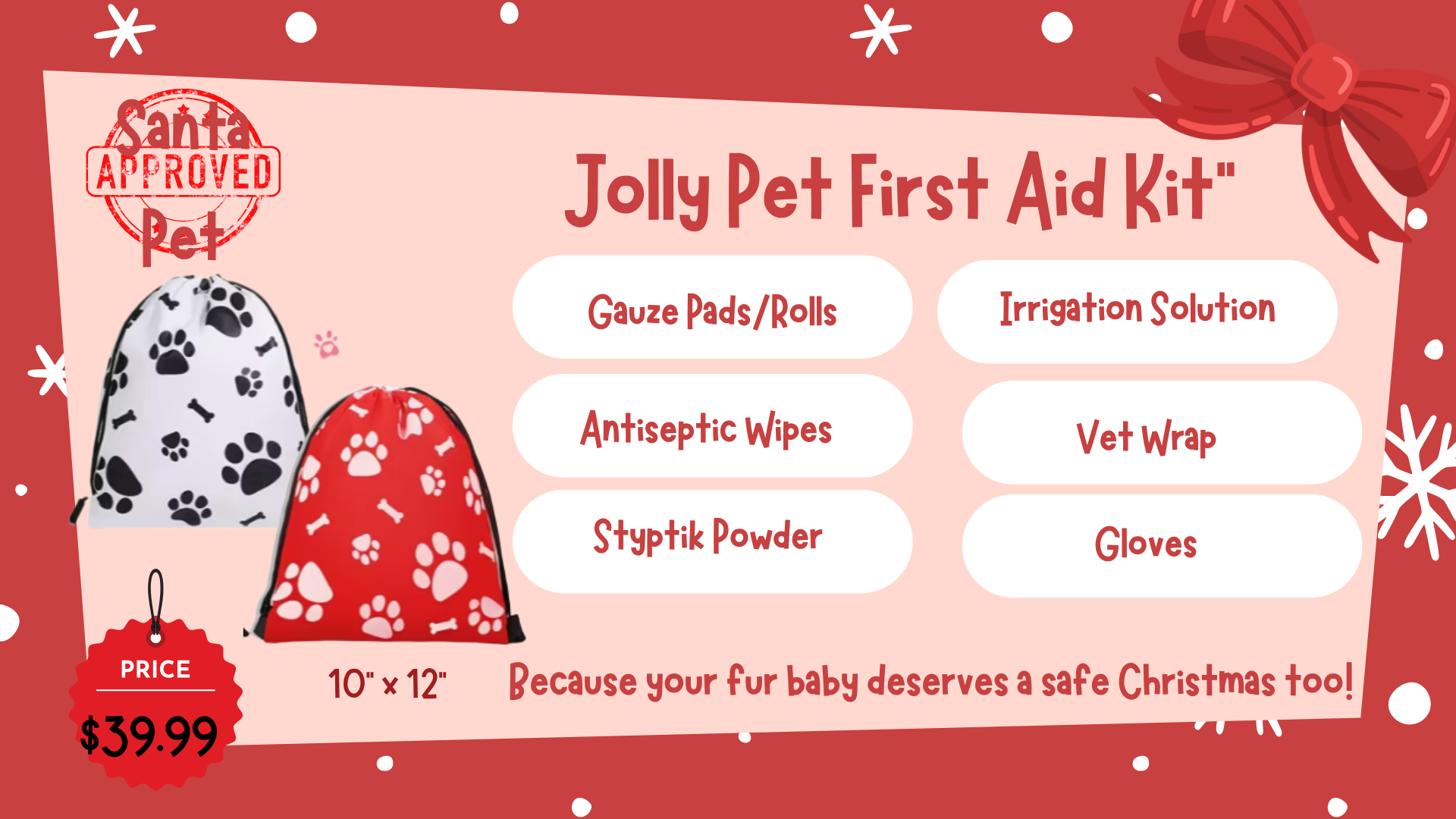 Keep your furry family members safe this holiday season with the Jolly Pet Kit — a festive, vet-approved first aid kit designed to treat common pet injuries at home or on the go. Packed with essential supplies for cuts, scrapes, paw injuries, and minor emergencies, this kit ensures your pet stays merry and healthy all year long.