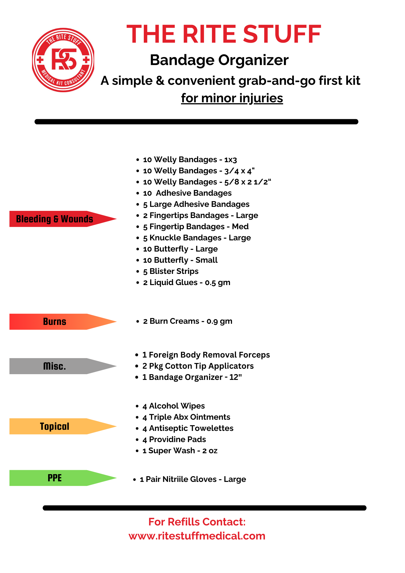 Introducing the Bandage Buddy, your Double-Sided Clear Plastic Bandage Organizer—the ultimate solution for keeping your first aid supplies organized, accessible, and ready for any situation. Designed for both home use and on-the-go convenience, this versatile, secure snap-shut lid, and compact organizer ensures you never leave home without the essentials for treating minor injuries. Stocked with irrigation supplies and a fun variety of kids bandages from Welly and a variety of durable bandages by My Medic.