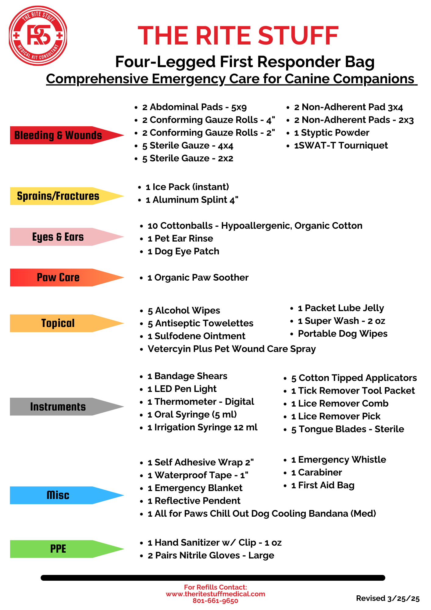 The Four-Legged First Responder Bag – your canine companion's ultimate first aid solution for outdoor adventures and unexpected emergencies. This comprehensive kit is designed to keep your furry friend safe from everything such as basic scrapes to severe bleeding and everything in between. So, whether you're hiking trails, exploring parks, or just enjoying a day in the great outdoors - make sure you and your pet are prepared for anything.